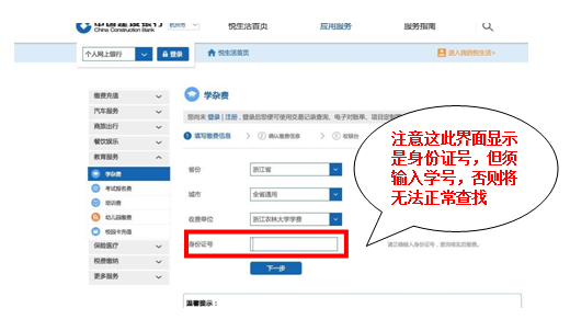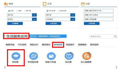 目前只支持浙江省内建设银行的柜面缴费,浙江省外暂不支持;如需进行手机银行或网上银行缴费的同学,须先到省内建行网点注册并开通此项业务,已开通过的同学可直接按图示操作缴费。