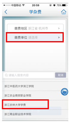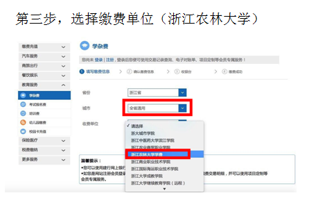 第三步,选择缴费单位(浙江农林大学)