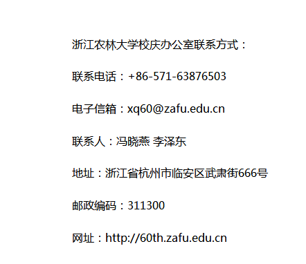 六十年栉风沐雨,一甲子春华秋实。2018年10月20日,学校将迎来建校60周年华诞。这是浙江农林大学发展史上的一个重要里程碑。热忱欢迎历届校友、学校离退休老同志、在校学生及在浙江农林大学工作过的教职工不吝赐稿。