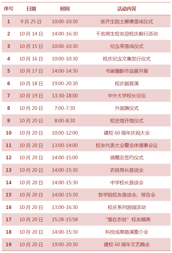 注:根据校庆筹备情况,校庆期间主要活动还将进行适当调整。校庆前后,学校各学院、部门还将开展各类学术、文化及校友联谊等活动。