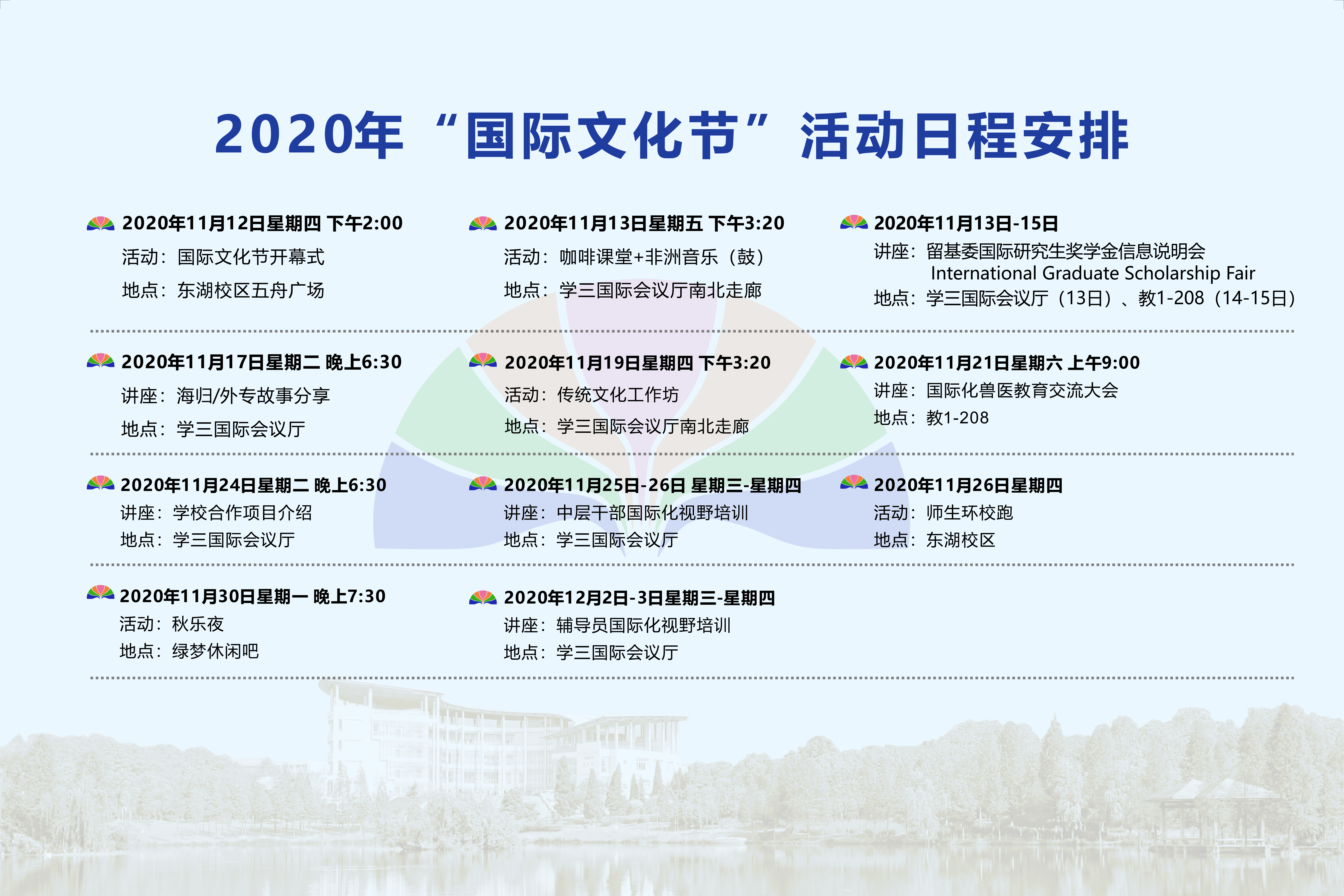 为提升全校师生国际化意识和能力,搭建一个相互理解、尊重包容、和谐互鉴、美美与共的多元文化交流平台,彰显浙江农林大学的国际化特色和多元文化气息,学校将在11月组织国际文化节系列活动,具体活动安排如下: