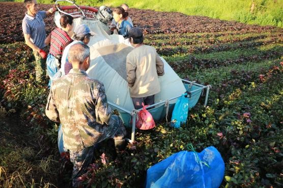 凌晨三点,实践团成员跟随老师驱车前往狄家㘰村参与今年第七茬的紫苏抢收活动。在紫苏种植农户王学林的指挥下,工人们分工明确、各司其职,收割工作进行得有条不紊。队员们在劳动氛围的感染下,或下田操纵机器进行收割,或帮忙运输收割完成的紫苏。在大家的协作下,紫苏抢收工作最终在早晨五点前顺利完成。