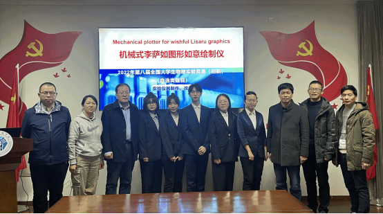 其中,由张中卫、郭明老师指导,机械设计194应龙、机械设计194马博慧、机械设计204杨倩、机械设计213陈婷、机械设计213向雯婧等5位同学组队,其参赛作品《机械式李萨如图形如意绘制仪》晋升决赛,经激烈角逐荣获自选课题类创新作品全国一等奖;由陈均朗、曾松伟老师指导,电子信息201马崧元、电子信息202汪文凯、电子信息201侯雅蓉、电子信息213沈杨、电子信息211司徒俊毅等5位同学组队,其参赛作品《利用分光计测透明液体的浓度》晋升决赛,经激烈角逐荣获命题类创新作品全国一等奖。由戴朝卿、王悦悦老师指导,电子信息201温学坤、计算机202王勤波、大数据202范宸昊、电子信息201徐钱前等4位同学组队,其参赛作品《被动锁模光纤激光器综合实验装置》获自选课题类创新作品全国二等奖。另有倪涌舟、徐一清老师指导的自选课题类创新作品《基于LabVIEW的空气比热容比测定系统设计》、以及由刘伟、郭中富老师指导的讲课类作品《密立根油滴》,分别获得全国三等奖。