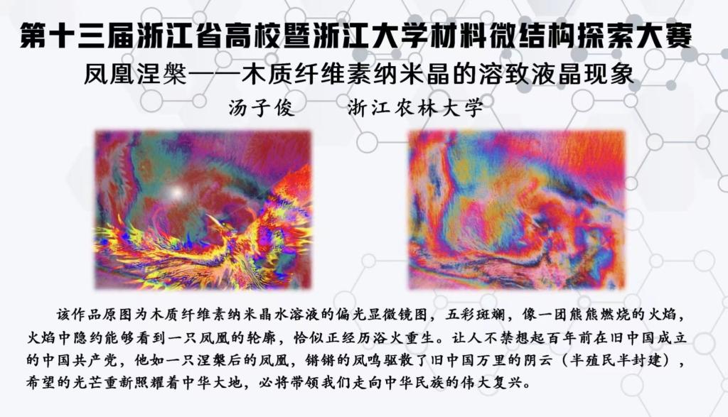 近日,第十三届浙江省高校暨浙江大学材料微结构探索大赛在线上举行,我校化材学院学生作品《凤凰涅槃——木质纤维素纳米晶的溶致液晶现象》荣获一等奖(第一名),并获得最佳人气效果奖。