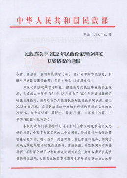 民政部全国民政政策理论研究成果奖是国内民政理论研究领域最高奖项。本次评选共收到全国民政系统和高校科研机构提交的论文2118篇,经专家评审,共计有39篇研究获得一等奖,129篇研究获得二等奖,163篇研究获得三等奖。