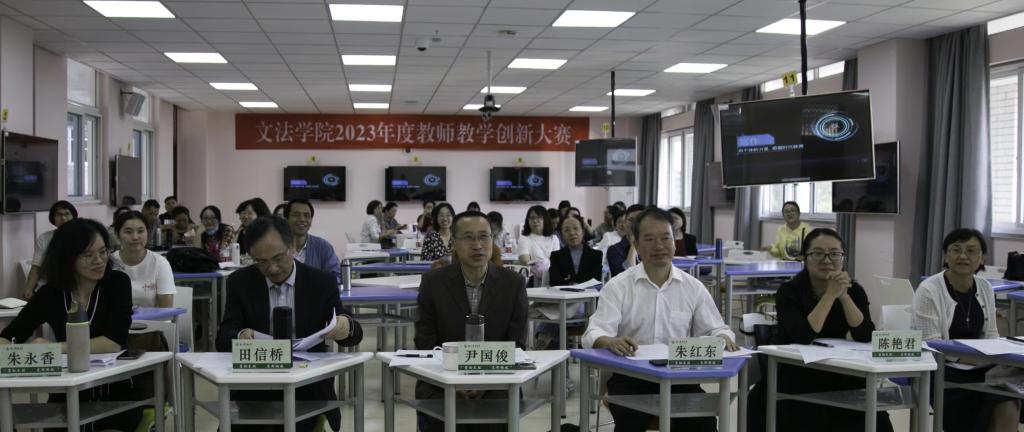 10月13日下午,文法学院在教学主楼515举行2023年度教师教学创新大赛,来自五个团队的五位教师参与本次比赛。本次创新大赛邀请教师发展中心主任尹国俊、校督导田信桥、学院党委书记朱红东、学院督导何琼、朱永香担任评委,各专业(部)部分教师到场观摩。