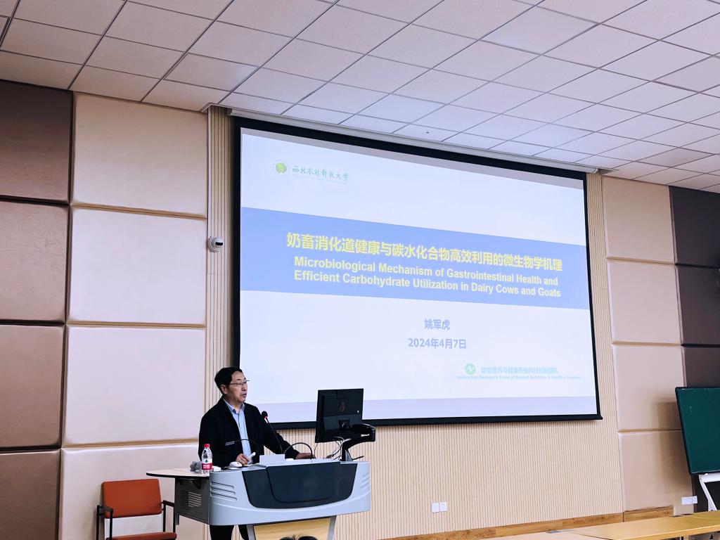 4月7日上午,中国动物营养学分会副理事长、中国动物营养指导委员会委员、西北农林科技大学二级教授姚军虎应邀为动科动医学院师生作题为“奶畜消化道健康与碳水化合物高效利用的微生物学机理”的学术报告。学院学科相关负责人及师生代表等100余人参加会议。