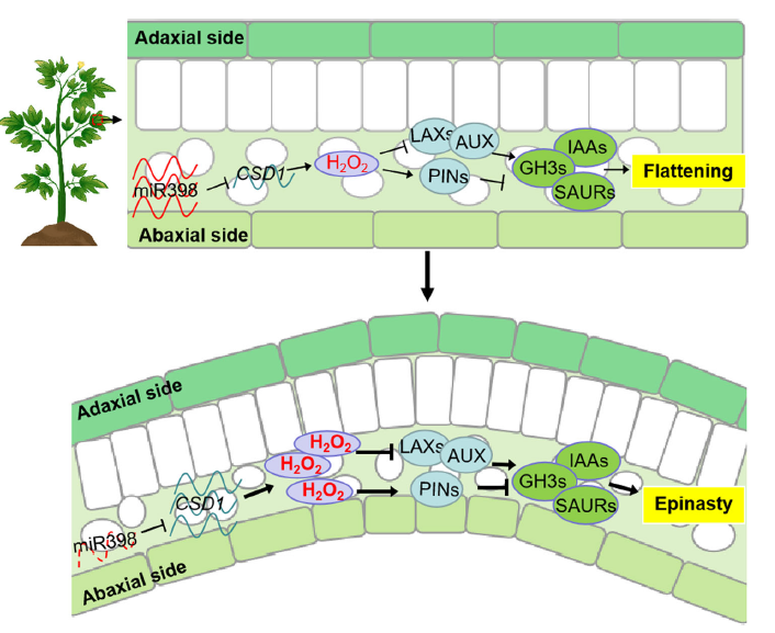 叶片的平展性在植物光能捕获和光合作用中发挥关键作用。植物叶片发生初期平展性形成的分子机制已比较明确,但成熟叶片平展性的维持机制尚不清楚。该研究发现,sly-miR398b在番茄叶片的远轴面特异性表达。采用CRISPR/Cas9敲除该基因后,突变体成熟叶片表现为偏上生长,而幼叶保持平展性。敲除sly-miR398b解除了对其靶基因SlCSD1(编码Cu/Zn超氧化物歧化酶)的抑制作用,导致远轴面SOD活性升高,H2O2积累。H2O2的增加下调了生长素外排基因表达,诱导了生长素内流基因表达,抑制了远轴面生长素响应信号,使得远轴面细胞增殖和膨大速率均低于近轴面,导致了叶片向下弯曲。外源施用生长素恢复了突变体的平展性表型。此外,在西瓜、烟草和白菜等作物中均发现了miR398在叶片远轴面的特异性表达,表明该作用机制可能具有普遍性。