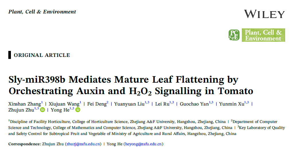近日,园艺科学学院设施园艺与品质调控团队在《Plant Cell & Environment》(中科院1区,IF5year=7.6)发表题为“Sly‐miR398b mediates mature leaf flattening by orchestrating auxin and H2O2signalling in tomato”的研究论文。研究结果揭示了sly-miR398b在维持番茄成熟叶片平展性的作用机制,可为设施茄果类作物光能利用和株型调控提供依据。