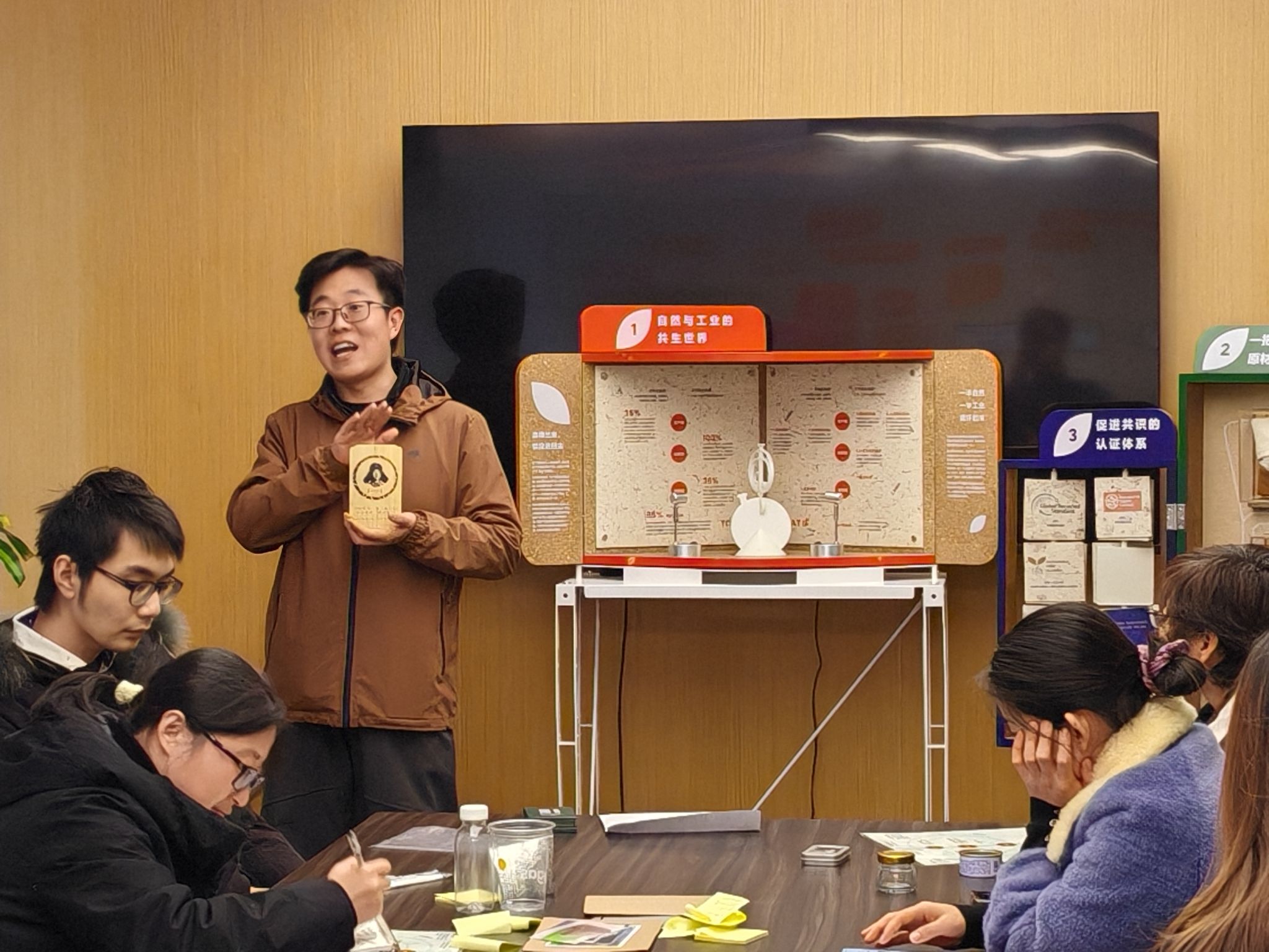本次活动中,雷锋班党支部代表作为主讲嘉宾,以共创和体验的方式,现场解读了日用品的工艺与材料,串联产品从生产到废弃的全链路,并向大家展示了学校学运用自主研发的刨切微薄竹技术以毛竹为原材料制作的“雷锋班”文创明信片,介绍了浙农林大生态育人之路与雷锋班的生态环境保护志愿服务。