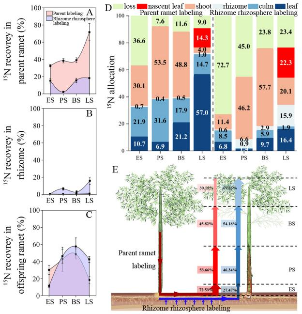 课题组创造性地在野外建立了“一竹一鞭一笋”模式系统,将毛竹从出笋到展叶这一快速生长阶段分为四个时期(快速生长初期、盛期、抽枝期和展叶期),采用15N同位素示踪和转录组测序技术,揭示了毛竹快速生长期氮素的动态供应机制。研究发现母竹和鞭根在毛竹快速生长期间分工合作为竹笋供应养分,形成从“母竹供应为主——母竹和鞭根协同供应——鞭根供应为主”的氮素供应策略(图1)。