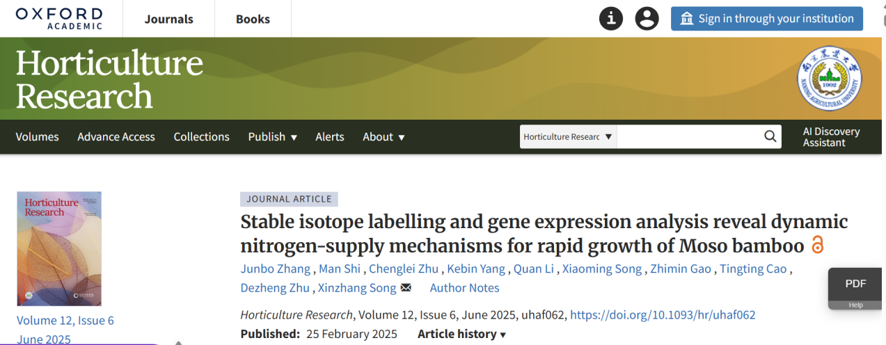近日,竹子研究院竹林碳汇与生态多功能服务创新团队在《Horticulture Research》(中科院农林科学1区Top,IF 7.6)发表题为“Stable isotope labelling and gene expression analysis reveal dynamic nitrogen-supply mechanisms for rapid growth of Moso bamboo”(《同位素示踪和基因表达分析揭示毛竹快速生长的氮动态供应机制》)的研究论文。竹研院宋新章教授为本文通讯作者,创新团队已毕业博士研究生张君波、施曼副教授,博士后朱成磊、青岛农业大学青年教师杨克彬为论文共同第一作者。浙江农林大学竹子研究院为该论文第一单位和通讯作者单位。国际竹藤中心高志民研究员、华北理工大学宋小明教授等为该论文提供了重要指导。