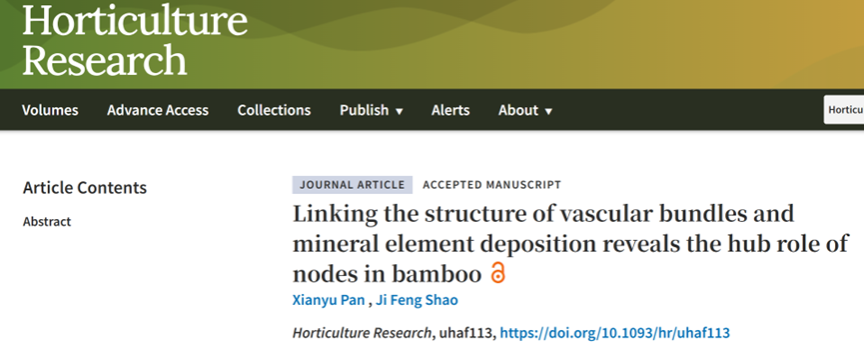 近日,竹子研究院硕士研究生潘显煜和教师邵继锋在《Horticulture Research》(中科院1区Top,IF 7.6)发表题为“Linking the structure of vascular bundles and mineral element deposition reveals the hub role of nodes in bamboo”(《维管束结构与矿质元素沉积结合,揭示节在竹子中的枢纽作用》)的研究论文。