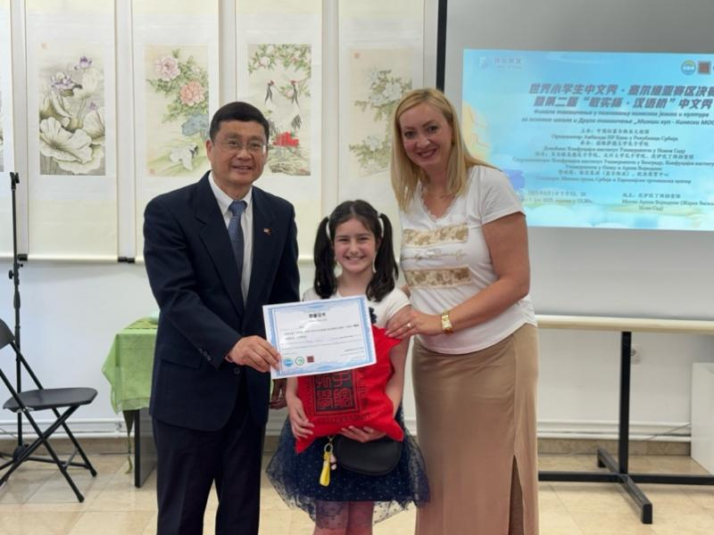 当地时间6月1日,诺维萨德大学孔子学院在伏伊伏丁那档案馆成功举办2025年“汉语桥”世界中文大赛塞尔维亚赛区决赛。此次比赛由中国驻塞尔维亚大使馆主办、诺维萨德大学孔子学院承办。中国驻塞尔维亚大使馆教育参赞袁纪纲,欧亚商贸中心董事长邹军伟,伏伊伏丁那档案馆副馆长德拉加娜·卡蒂克(Dragana Katic),诺大孔院塞方院长伊万娜·捷万契维奇·塞凯露丝(Ivana Živanćević Šekeruš)、中方院长陈秀、各教学点负责人,贝尔格莱德孔院中方院长武鹏,尼什大学孔院中方院长高静,驻塞中资企业代表等受邀出席,孔院师生、学生家长等百余人共同观摩比赛。