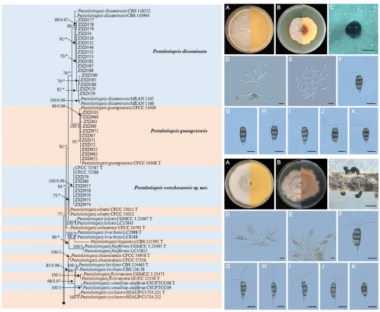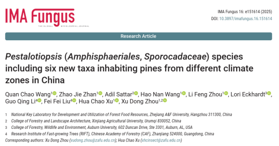 近日,全国重点实验室森林-昆虫-微生物互作机制研究课题组在真菌学领域国际著名期刊《IMA Fungus》(中科院1区Top,IF5yr= 5.2)发表题为“Pestalotiopsis (Amphisphaeriales,Sporocadaceae) species including six new taxa inhabiting pines from different climate zones in China” (《中国不同气候地区的松属植物上发现六个拟盘多毛孢属新物种》)的研究论文。浙江农林大学为该论文第一单位和通讯作者单位。森保学科三年级博士研究生汪全超为第一作者,徐华潮教授和周旭东教授为通讯作者。