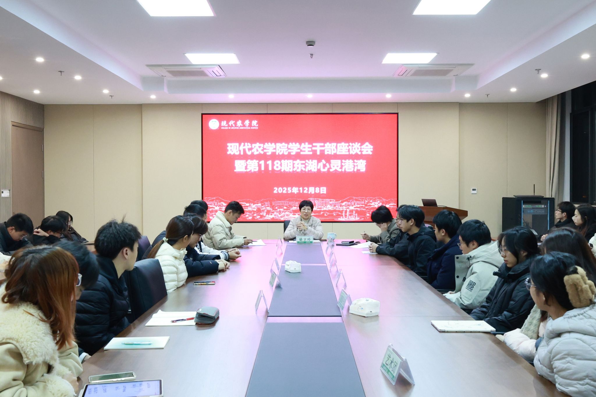 12月8日晚上,农学院学生干部座谈会在学17-502召开。学院党委书记梁卫玲、学院学生工作负责人、团委书负责老师出席会议,学院团委、学生会相关学生负责人共同参加。学生代表院团委副书记向学院党委作了团委2025年度工作汇报,部门负责人代表作了工作经历和成长感悟的分享。