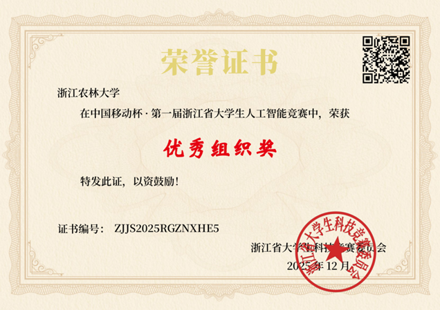 近日,浙江省大学生科技竞赛委员会主办的“中国移动杯·第一届浙江省大学生人工智能竞赛”获奖名单揭晓。我校参赛队伍团结拼搏,表现突出,荣获一等奖3项,二等奖3项,三等奖7项,同时获评“优秀组织奖”。