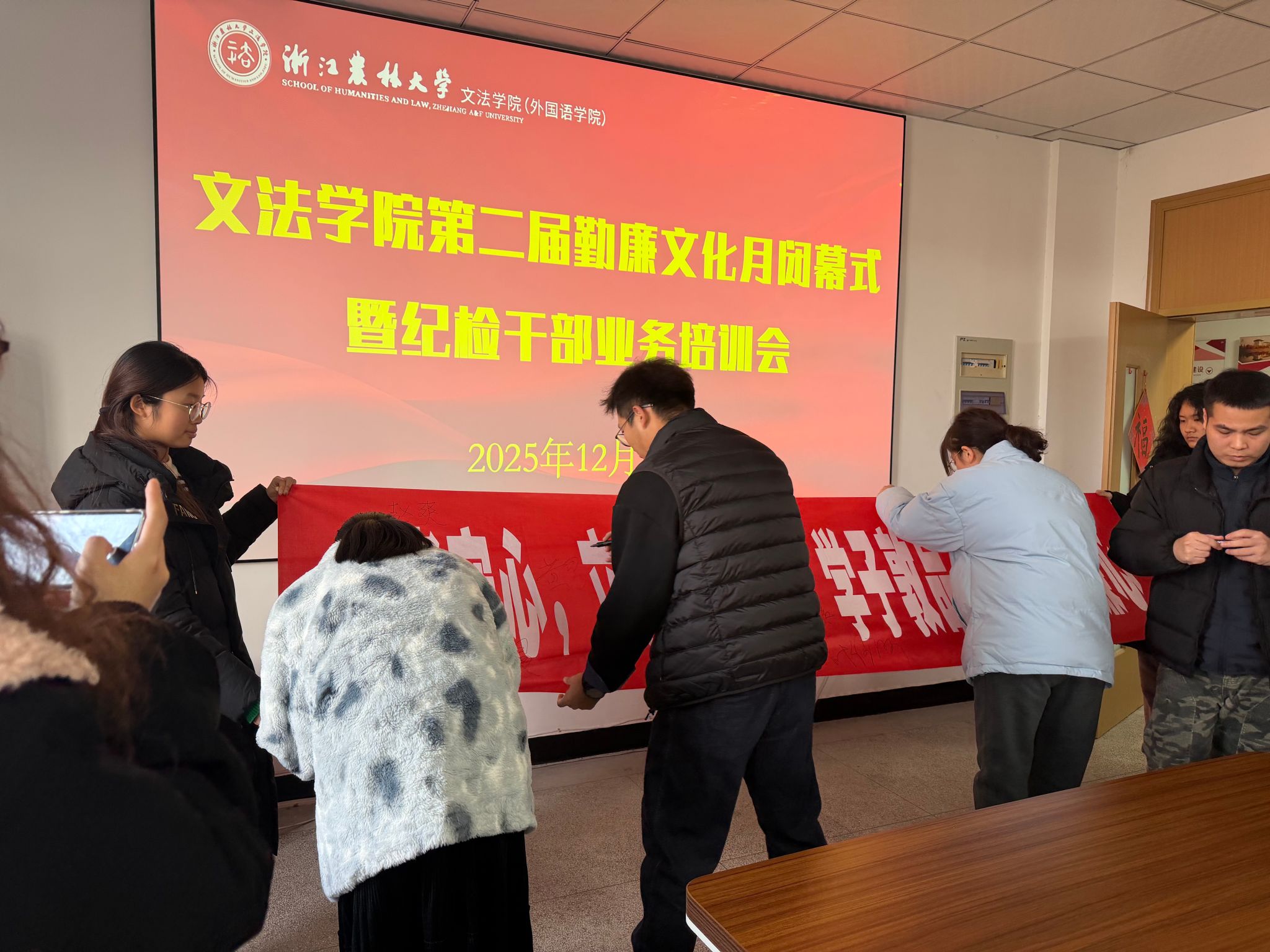 在廉洁承诺签名环节,全体参会人员在印有“师者守心,立行当表率;学子敦品,修身养廉心”的横幅上郑重签名。纪检干部业务培训环节,朱红东结合审计工作实际,通过典型案例剖析,讲解了高校工作中常见廉洁风险点及防范措施;纪检监察室、巡察办办公室相关负责人肯定了文法学院在勤廉文化建设方面的先行探索,详细剖析了公务接待、科研经费使用、师德师风等方面易发多发的风险问题和纪律要求;马院相关负责人从党的作风建设出发,强调了作风建设作为党的生命线和人心向背“晴雨表”的重要性。