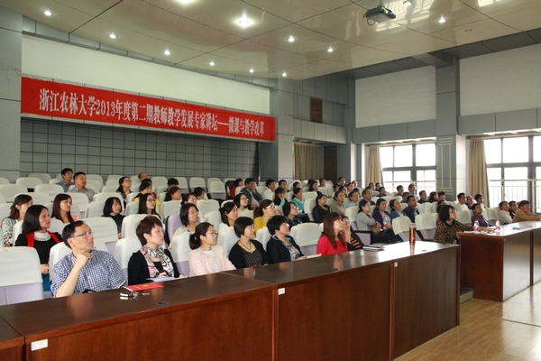 浙农林大新闻网讯 为贯彻《关于举办首届全国高校微课教学比赛的通知》(教培函〔2012〕7号)、《浙江省教育厅办公室关于组织参加首届全国高校微课教学比赛的通知》(浙教电传〔2013〕77号)的文件精神,我校于4月16日下午在学11301举行了题为“微课与教学改革”的年度第二期教师教学发展专家讲坛。本次活动由杭州师范大学现代教育技术中心主任茅育青教授担任嘉宾,教务处负责人担任主持,各学院(部)分管教学负责人、参与微课教学比赛的教师、第二期青年教师研修班教师、校级及以上精品课程负责人参加了活动。