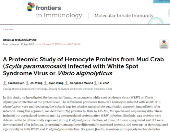 近期,动物科技学院朱斐实验室在国际学术期刊《Frontiers in Immunology》、《Scientific Reports》杂志上分别发表题为“A proteomic study of hemocyte proteins from mud crab (Scylla paramamosain) infected with white spot syndrome virus (WSSV) orVibrio alginolyticus”和“MicroRNA-100 is involved in shrimp immune response to white spot syndrome virus (WSSV) andVibrio alginolyticusinfection”的文章,朱斐副研究员为论文通讯作者,硕士研究生孙保贞、王徵分别为文章的第一作者。