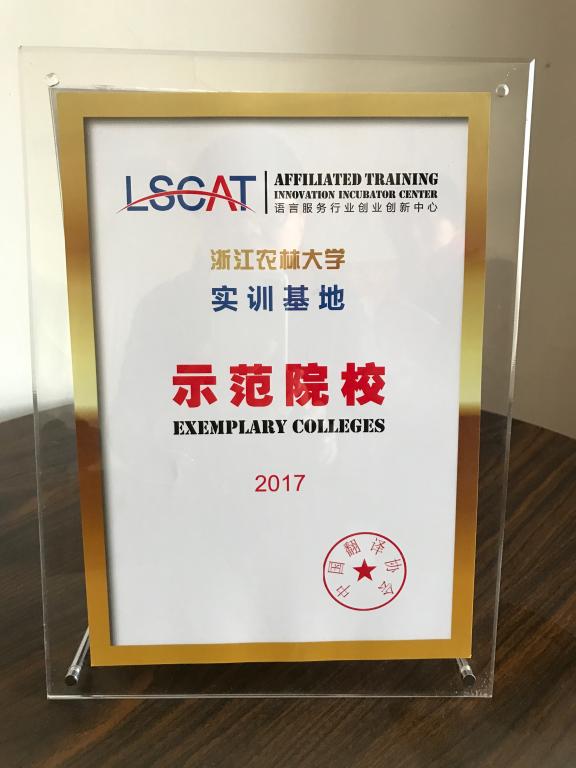大会为在2017年度中国翻译协会LSCAT项目中成绩卓越的学校颁发荣誉证书。中国翻译协会授予我校“语言服务行业创业创新中心”实训基地全国示范院校。浙江省仅有两所高校获此殊荣。
