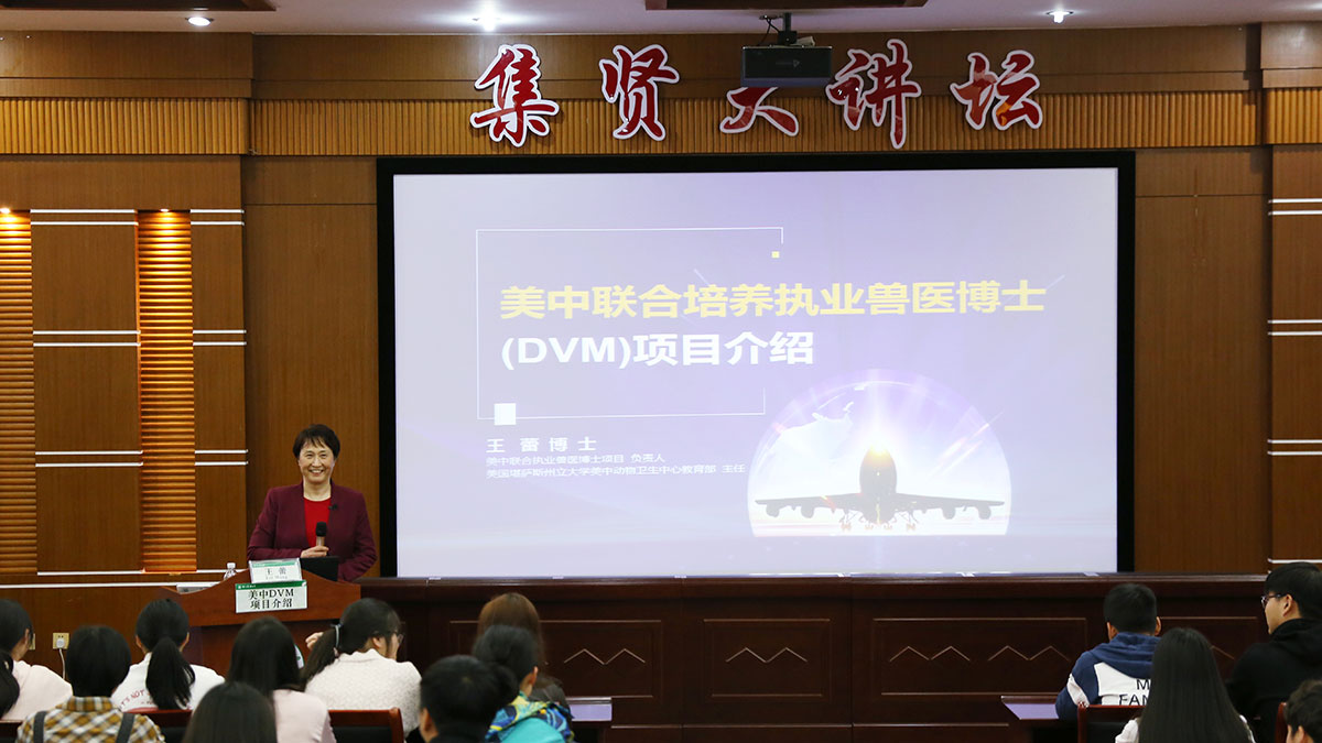 3月21日,中美联合培养执业兽医博士(DVM)奖学金项目报告会在我校集贤大讲坛举行。美中动物卫生中心教育主管、美国堪萨斯州立大学兽医学院王蕾博士做专题报告。会议由动科院宋厚辉院长主持。 我校动物医学专业和集贤学院新农班学生参加了报告会。