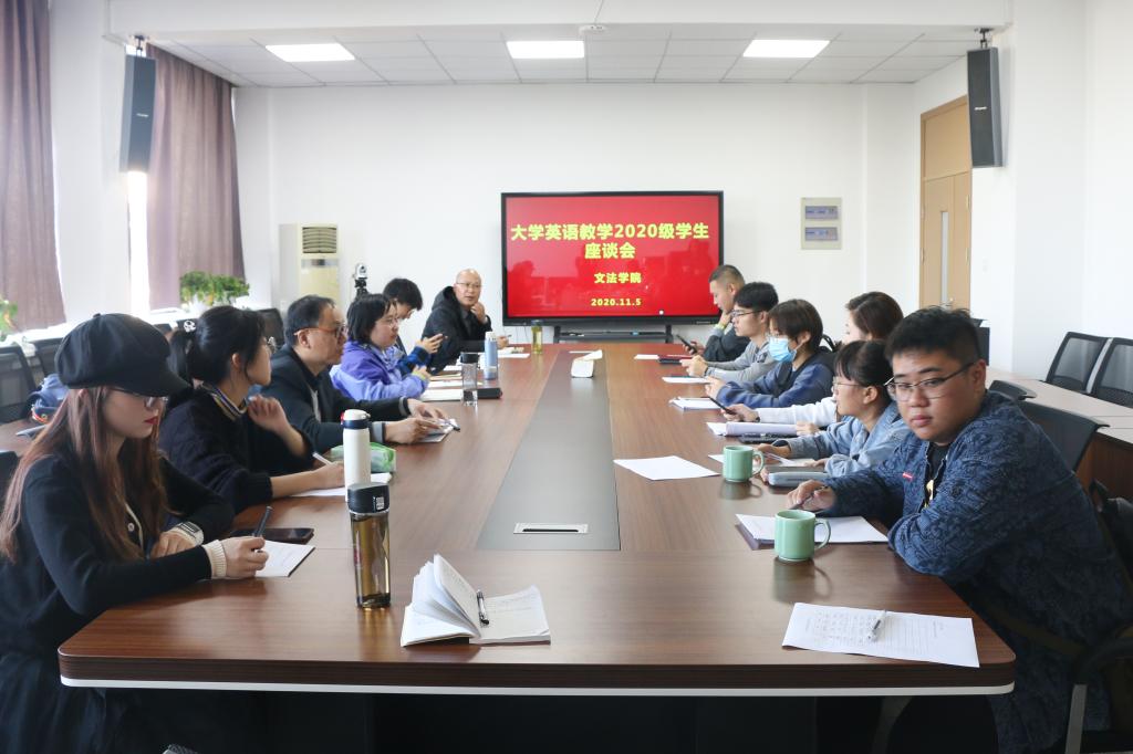 为及时了解我校大学外语教学改革情况,发现并解决教学过程中存在的问题,促进大学外语教学改革,11月5日,文法学院召开了大学外语教学改革2020级学生座谈会。学院相关负责人、外国语言文学学科负责人、公外部相关老师代表以及卓越、提高和基础班的10多位学生代表参加。