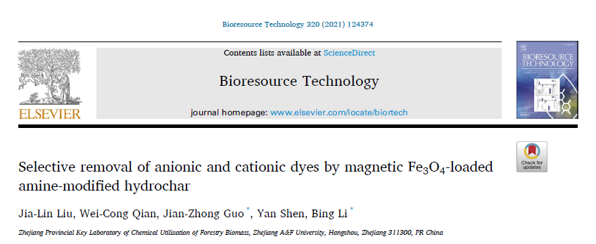 近日,我校理学院应用化学专业18级本科生刘佳琳,在李兵副教授和郭建忠教授的共同指导下,以第一作者在国际著名期刊《生物资源技术》(Bioresource Technology),IF=7.539,中科院一区(TOP期刊)上发表题为《负载磁性四氧化三铁氨基修饰水热炭用于选择性吸附阴离子和阳离子染料》(Selective removal of anionic and cationic dyes by magnetic Fe3O4-loaded amine-modified hydrochar)的研究论文。