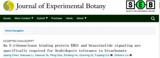 近日,生物学Top期刊《Journal of Experimental Botany》(IF5year=7.01)以“An S-ribonuclease binding protein EBS1 and brassinolide signaling are specifically required for Arabidopsis tolerance to bicarbonate”为题发表了国家重点实验室林木分子改良研究团队的研究成果,校省部共建亚热带森林培育国家重点实验室为第一单位,硕士研究生陈吉鹏为第一作者,崔富强副教授、柳参奎教授为论文通讯作者。