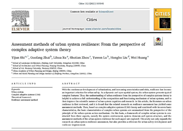 日前,由我校园林学院青年教师施益军博士主笔,徐丽华教授参与合作的学术论文“Assessment Methods of Urban System Resilience: From the Perspective of Complex Adaptive Systems Theory” (https://doi.org/10.1016/j.cities.2021.103141 )在国际知名期刊《Cities》上发表。《Cities》期刊全名为《Cities: The International Journal of Urban Policy and Planning》,是Thomson Reuters收录SSCI期刊,当前其影响因子为4.802,综合排名在所有城市研究类(Urban Studies) SSCI期刊中名列第一,为城市研究领域的国际权威期刊。