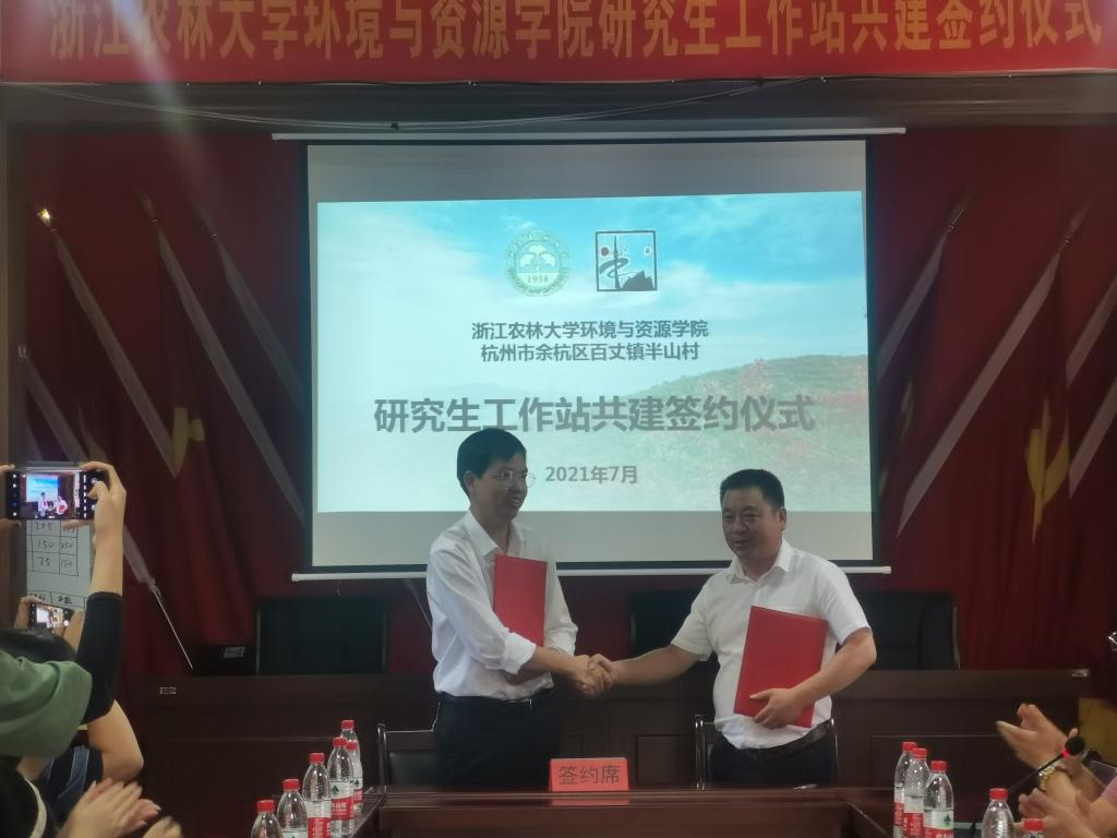 7月12日,环资学院相关负责人带领碳中和研究生、森林经理学研究生党支部以及暑期社会实践团队赴杭州市余杭区百丈镇半山村开展研究生工作站共建签约仪式。