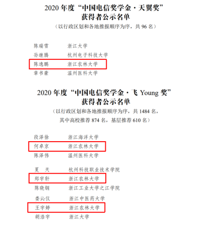 近日,由共青团中央、中国电信集团有限公司、全国学联联合开展遴选工作,中国光华科技基金会负责具体组织实施工作的2020年度中国电信奖学金推报活动结果揭晓。我校陈逸鹏、何卓京、郑宇轩、王宇婷荣获2020年度中国电信奖学金。