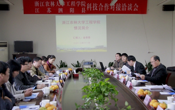 浙农林大新闻网讯 11月14日下午,工程学院与江苏泗阳县科技对接洽谈会在学9306会议室召开。泗阳县发改局局长魏三祥带队的县府部门及科技成长型企业一行12人参会,校社会合作处负责人、工程学院相关领导、教师代表及部分大四学生参加座谈。