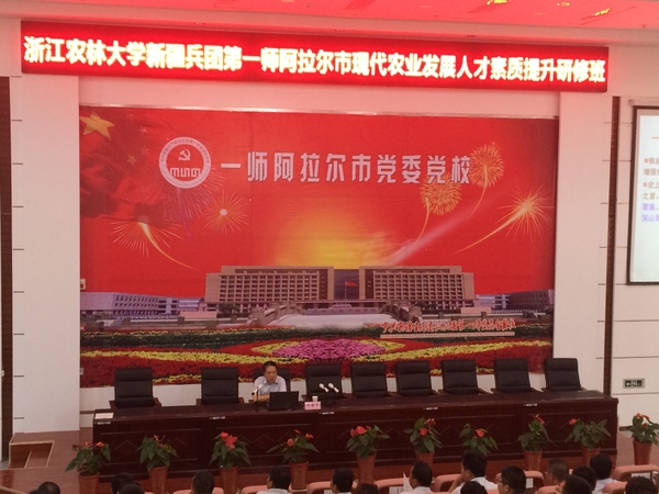 在第一师党校学术报告厅举行的“浙江农林大学新疆兵团第一师阿拉尔市现代农业发展人才素质提升研修班”开班式上,第一师分管领导、党校领导及台州援疆指挥部的领导共同参加了开班式。我校5名专家分别对来自全师各团场200余名农业科技干部进行了为期4天的专业培训。