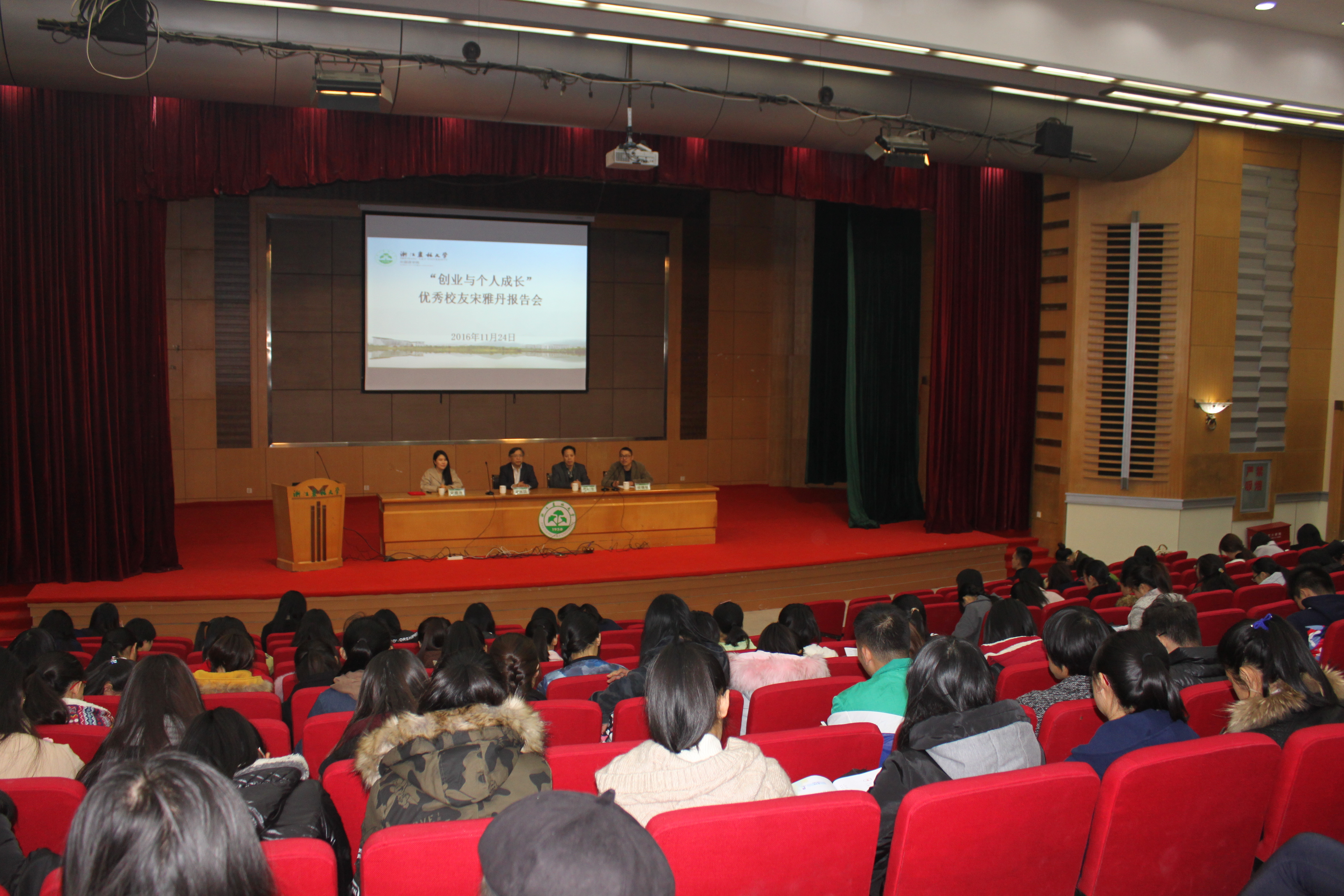 11月24日下午,我校第九期创业论坛在衣锦校区报告厅举行,05级室内与家具设计专业毕业生宋雅丹应邀作“创业与个人成长”主题报告。创业处处长朱永法、外语学院党总支书记张敏生出席此次报告会,外语学院教职工和全体学生参加本次报告会。