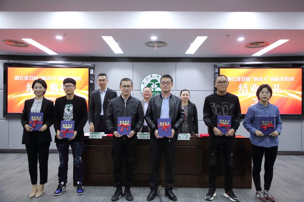 仪式上,宣布了《关于授予楼超等78名学员浙江省“新农人”创新实验班结业证书的决定》,为学员代表颁发了结业证书和特别定制的专属徽章。宣读了《关于表彰浙江省“新农人”创新实验班第一届优秀学员的决定》,就坐主席台领导为优秀学员颁发荣誉证书。