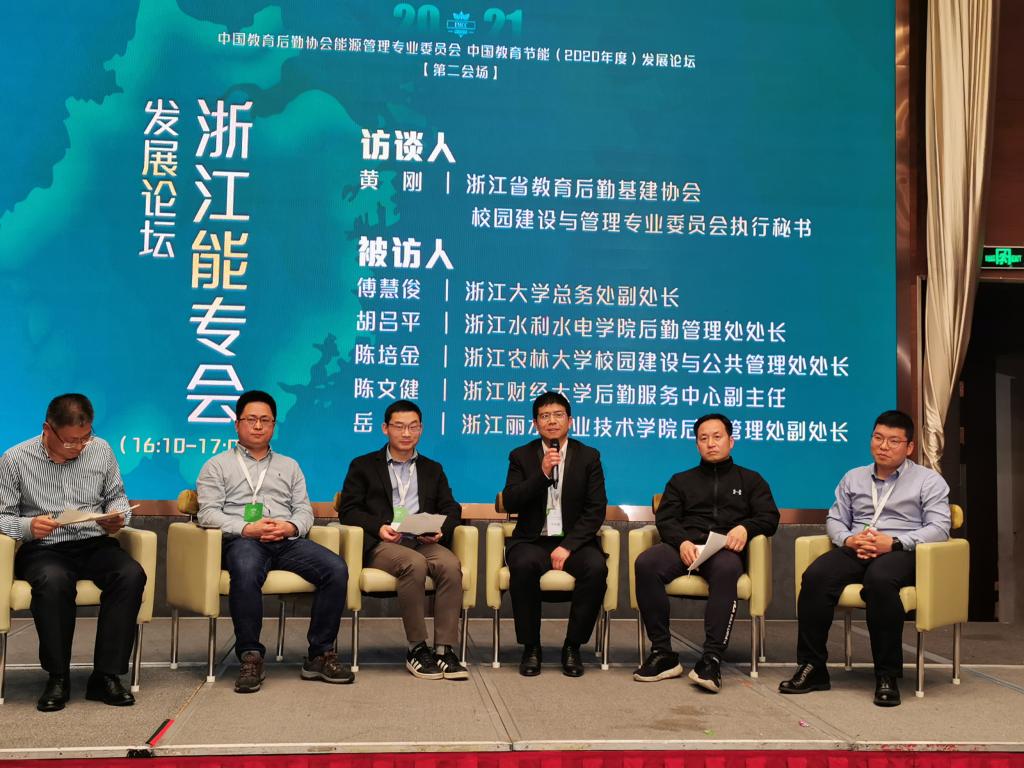 陈培金受邀参加中国教育节能(2020年度)发展论坛——浙江能专会主题论坛,并做讲话。陈培金表示,本次会议对我校绿色学校建设具有重要的指导意义,他结合学校实际工作讲述了大数据、云计算、物联网等新技术如何运用到教育节能中去。他表示,学校智慧节能平台融入到学校“智慧农林”整体信息化平台,建设更具可操作性、规划性,用户体验度更好。陈陪金还介绍学校全面实施“生态育人、育生态人”工程和学校下一步教育节能工作规划。