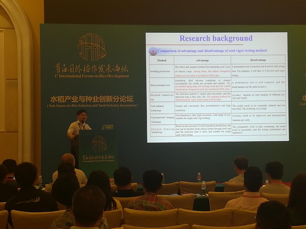 大会共设置了四个分主题:水稻资源与种质创新、稻作栽培与绿色生产、水稻产业与种业创新、稻作文化传承与创新发展。在“水稻产业与种业创新”分论坛上,我校赵光武教授应邀作了“氧传感技术和高光谱技术在水稻种子活力检测中的应用”的学术报告,系统介绍了氧传感技术和高光谱技术的原理及其在水稻种子活力检测方面的研究进展,并围绕水稻种子质量的快速无损检测与分选技术进行了总结和展望,获得了与会专家及同行的高度关注。
