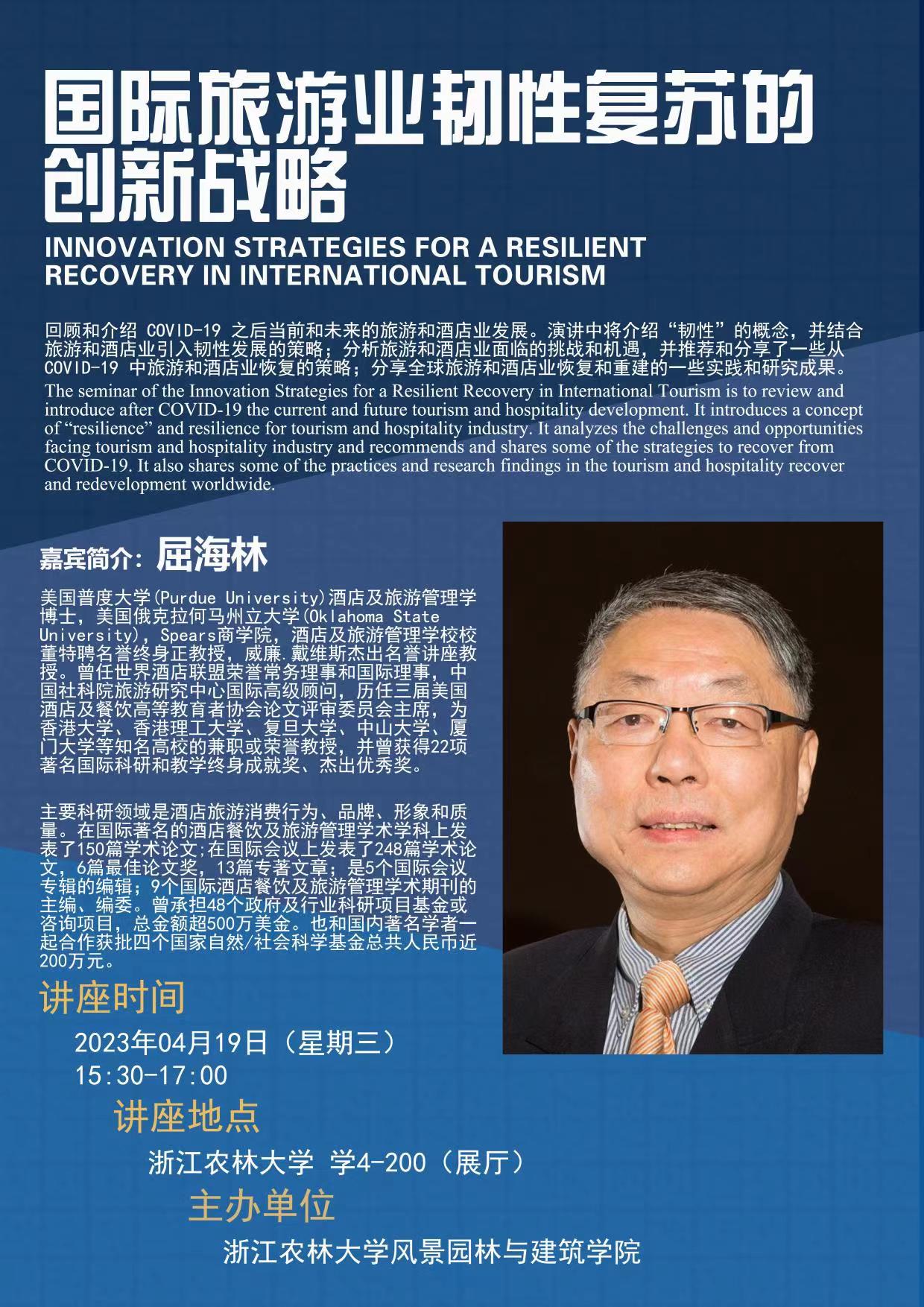 讲座内容:回顾和介绍COVID-19 之后当前和未来的旅游和酒店业发展。演讲中将介绍“韧性”的概念,并结合旅游和酒店业引入韧性发展的策略;分析旅游和酒店业面临的挑战和机遇,并推荐和分享了一些从 COVID-19 中旅游和酒店业恢复的策略;分享全球旅游和酒店业恢复和重建的一些实践和研究成果。