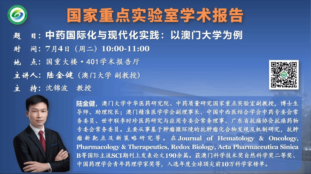 讲座预告:中药国际化与现代化实践:以澳门大学为例