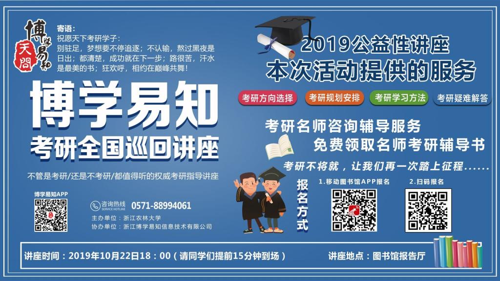 为满足今年正在准备考研的在校考生更清晰地了解本年考研情况,做好考前冲刺的准备工作;同时也使未来准备考研的同学更好的了解考研,解除对考研的疑惑,消除对考研的心理压力,能够正确地认识考研,动员更多的学生加入到考研的队伍中来,浙江农林大学图书馆和浙江博学易知信息技术有限公司合作开设本次考研讲座。