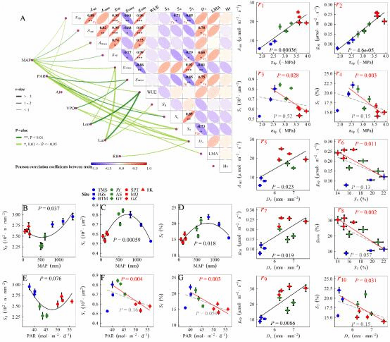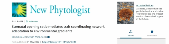 近日,国家重点实验室森林生态学团队(李彦教授团队)以长文形式在New Phytologist(IF = 10.151)发表题为“Stomatal opening ratio mediates trait coordinating network adaptation to environmental gradients”的研究论文。该研究系统阐述了树木末端器官(枝条和叶片)功能性状(光合、气孔解剖、气孔功能、叶经济谱和水分相关性状)沿降水梯度带区域分异规律,以及由功能性状相互作用构成的协作网络沿降水梯度带的变异规律,结果发现气孔打开比例(gratio)介导了性状网络对环境梯度的适应性(类似于相互关联的性状选举出一个中心性状——气孔打开比例——居中调控整个网络响应环境变化)。