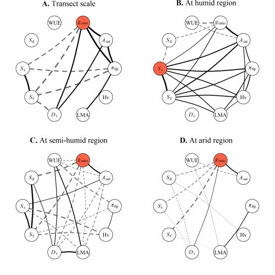 (3)网络分析进一步揭示了克服这些阈值的机制,即气孔打开比例在不同的空间尺度上均是网络中心性最高的性状(Fig. 4),从而介导了协作网络沿环境梯度的适应性变化。介导作用具体表现为:在湿润地区,叶片虽然发育了最大解剖学导度(gsmax),但为病原体防御需要,其打开比例(gratio)是最低的;在半湿润/半干旱区,气孔的打开比例保持在最佳位置(gratio≈ 20%,保卫细胞在这一位置其运动最佳,打开和关闭动作最迅速,因而可以迅速调节二氧化碳进入和水分丧失),从而获得了最高的水分利用效率;在干旱区,因为叶片冷却和气体交换的需要,叶片拥有最低的gsmax,但最大的gratio(这一发现也解释了干旱区物种的机会主义行为:即干旱区植物利用湿润周期,使其光合作用远大于湿润区物种的现象)。