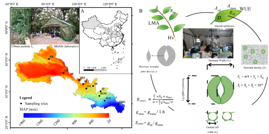 性状协作网络是由相互关联的功能性状构建而成,能够反映基于性状的适应策略。然而,对协作网络跨空间尺度的变化特征,以及哪些驱动因素和机制调节了这种变化仍然不清楚。本研究以广布种——西伯利亚榆树(Ulmus pumila)为研究对象,沿中国东南湿润区(潮湿森林)到西北干旱区(干旱荒漠)设置3800公里的研究样带(该样带垂直于降水梯度;Fig. 1A),通过将光合、气孔解剖、气孔功能、叶经济谱和水分相关性状整合为一个协作网络(Fig. 1B),填补了上述研究空白。