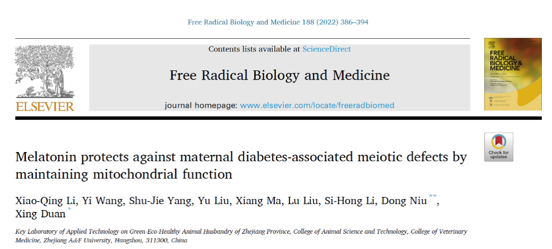 7月1日,段星教授团队指导研究生李晓庆在国际知名医学期刊Free Radical Biology and Medicine(中科院二区Top,IF: 8.101)发表题为“Melatonin protects against maternal diabetes-associated meiotic defects by maintaining mitochondrial function”的研究论文。