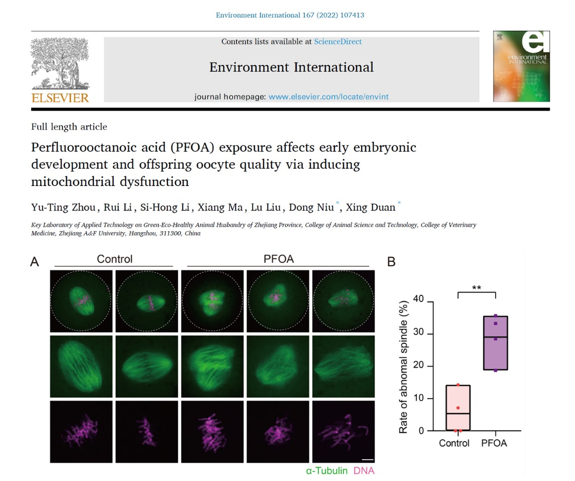 7月18日,动科动医学院段星、牛冬教授团队指导动物科学2019级本科生周雨亭在国际知名期刊Environment International(中科院一区,IF: 13.352)在线发表题目为Perfluorooctanoic acid (PFOA) exposure affects early embryonic development and offspring oocyte quality via inducing mitochondrial dysfunction” 的研究论文。该研究系统阐述了全氟辛酸(PFOA)对雌性动物早期胚胎发育及子代卵巢功能的影响及作用机制,为解决环境内分泌干扰物影响雌性动物生殖健康提供了重要理论依据。