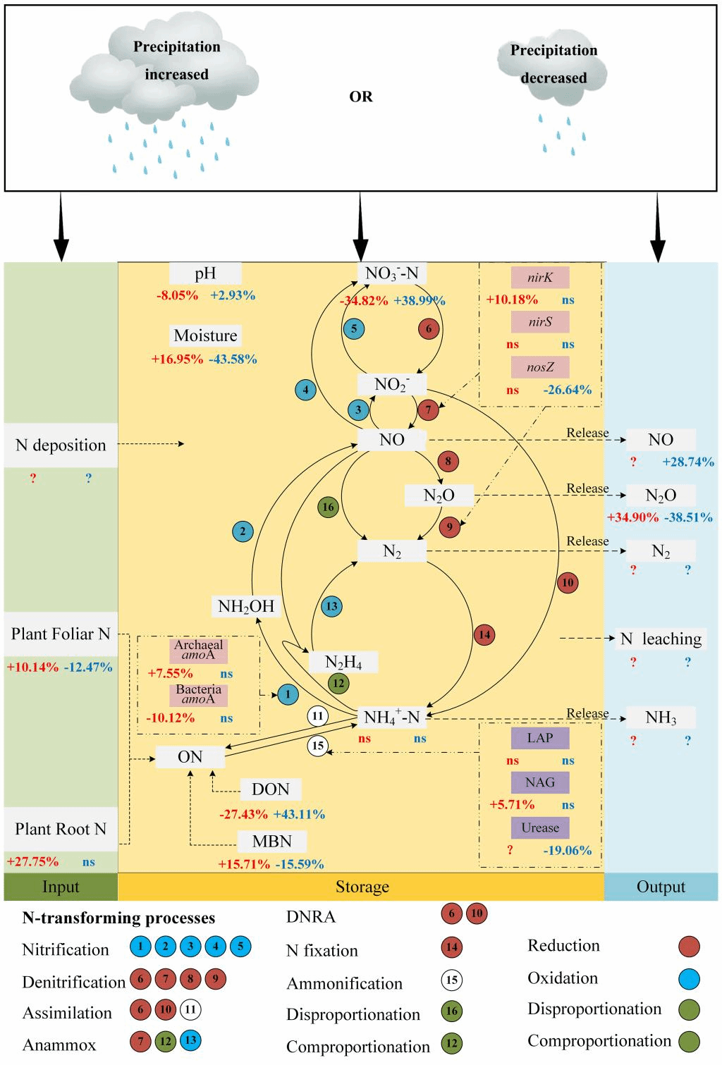 全球气候变化导致的降水改变将对生态系统土壤氮循环施加强烈影响。然而,降水改变是否会对全球范围内干旱区和湿润区的土壤氮循环过程产生不同影响尚不清楚。因此,李彦教授团队整合分析了1036对观测结果,量化了全球范围内降水增加和减少对干旱区和湿润区土壤氮输入(植物氮返还)、固存(土壤中各形态氮)和输出(气态氮排放)的影响,填补了上述空白。研究结果表明:(1)降水增加显著提升了土壤氮输入和输出,却降低了土壤氮固存;而降水减少产生的影响与之完全相反;(2)干旱区土壤氮循环对降水增加更为敏感,而湿润区土壤氮循环则对降水减少更为敏感;(3)降水改变对土壤氮循环的影响与降水类型(降雨与降雪)无关;(4)局部地区的年平均降水量是调节土壤氮循环对降水改变做出具体响应行为的关键。这意味着,土壤氮循环对降水增加和减少的响应行为在干旱区和湿润地区之间存在具体差异,全球气候变化将对这两种气候区内土壤氮循环产生不均衡的影响作用。因此,在未来构建相关模型进行预测研究时,为提升相关研究的精确性,应着重考虑干旱区和湿润区之间差异。