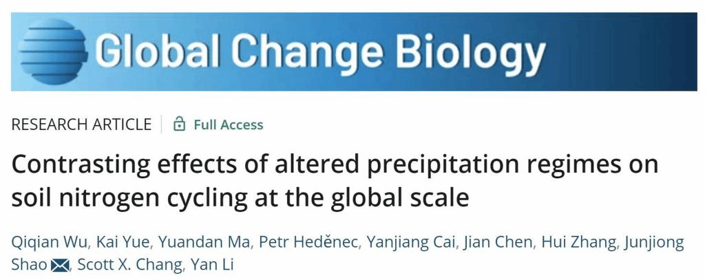 近日,国家重点实验室森林生态学研究团队(李彦教授团队)再次以长文形式(Research Article)在国际知名期刊《Global Change Biology》(中科院1区,IF = 13.211)发表原创研究成果。该研究以“Contrasting effects of altered precipitation regimes on soil nitrogen cycling at the global scale”为题,系统阐述了全球范围内干旱区和湿润区土壤氮循环过程(输入、固存和输出)对降水改变的不均衡响应。
