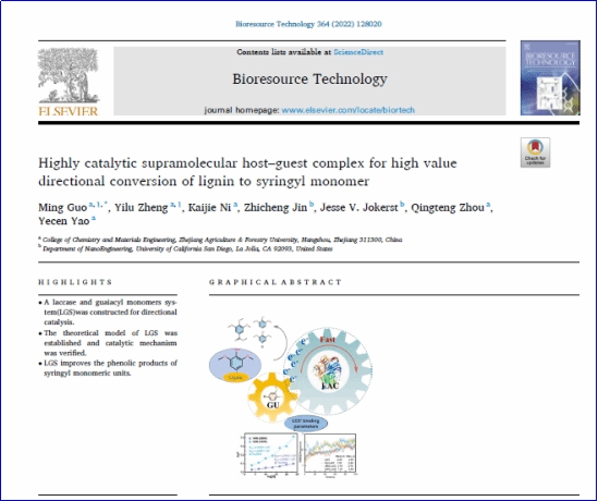 近日,化学与材料学院郭明教授团队在国际农林领域期刊《Bioresource Technology》(中科院1区TOP期刊,影响因子11.889)发表了题为“Highly catalytic supramolecular host-guest complex for high value directional conversion of lignin to syringyl monomer”的论文。该研究构建一种酶-介质系统对脱碱木质素进行酶催化降解方法,具有高降解率、高转化率等优点。