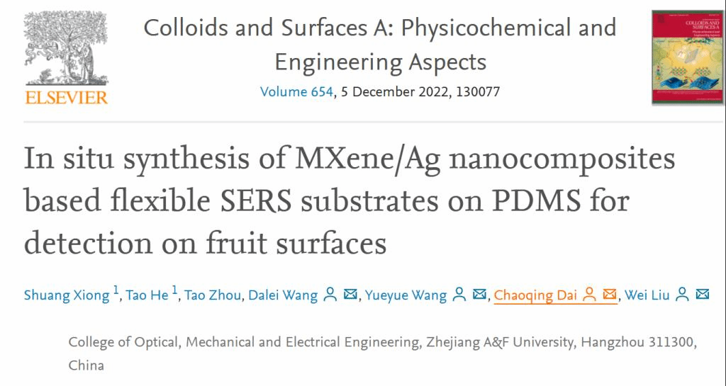拉曼光谱作为一种快速无损的检测被广泛应用于生物检测中,在前期工作中,团队以贵金属和MXene为复合衬底,对低浓度的农药进行检测,可实现微量农药的检测,为生态农业提供了可靠的技术支撑,这一项工作发表在Colloids and Surfaces A: Physicochemical and Engineering Aspects(中科院2区,IF=5.518),浙江农林大学为唯一单位,通信作者为王悦悦教授、戴朝卿教授、刘威副教授。